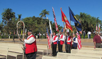 Warrior Association AIWA Participation at the Massing of the Colors It is a grand, glorious, patriotic day at the Massing of the Colors on November 3, 2012; AIWA was early for the event at the Balboa Park Organ Pavilion. They were there in honor of those military veterans and the thousands of Tribal Americans who have served the nation. They were there in honor of those military veterans and the thousands of Tribal Americans who have served the nation. We serve to educate, inspire and respect by example at this formal presentation of the Colors and our Indian flag is a tribute to our traditional sovereignty. This inspiring patriotic service is a tribute to our flag and to those who are in harms way while serving our country, who have served, and those who have given their lives in the service of our country.