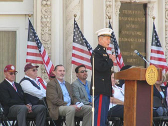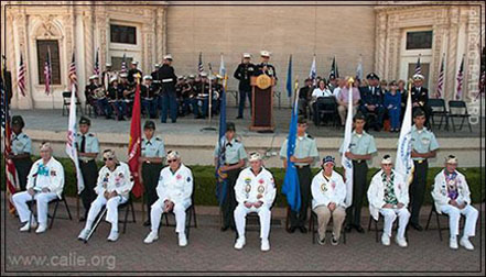 The San Diego Chapter of Military Order of World Wars (MOWW) organizes this yearly event with Color Guards, Band, and community Leaders. The American Indian Warriors appreciate the consideration of Marine Corp Coronel Jack Hawkins for placement at the forefront of the color guard order of entry. Additionally it is always a special occasion to be in the company of Pearl Harbor Survivors. Finally, we were additional pleased that one of our members, Lawrence Butch Strickland USN Pueblo POW, was on stage with the dignitaries and led the audience in the pledge of allegiance. |