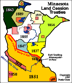 In peace and friendship the Dakota ceded 21 million acres, over half the territory of Minnesota, many waters in Dakota language; in the 1851 Traverse des Sioux Treaty of Peace and Friendship. Despite federal promises of protection and assistance, at the Minnesota River reservations, the Dakota Santee were badly mistreated by corrupt federal Indian agents and contractors. This non-fulfillment of treaty promises issue resulted in the Dakota Santee Sioux being found guilty by military court of joining in the so-called "Minnesota Uprising." This avoidable tragedy was actually part of the wider Indian conflicts that plagued the West during the second half of the nineteenth century. For nearly half a century, the US govt. had been selling land in the west to pay for past and current wars domestic and abroad. Anglo and German settlers invaded the Dakota Santee Sioux territory in the beautiful Minnesota Valley, and government pressure gradually forced the Dakota Indians to relocate to smaller reservations along the Minnesota River.