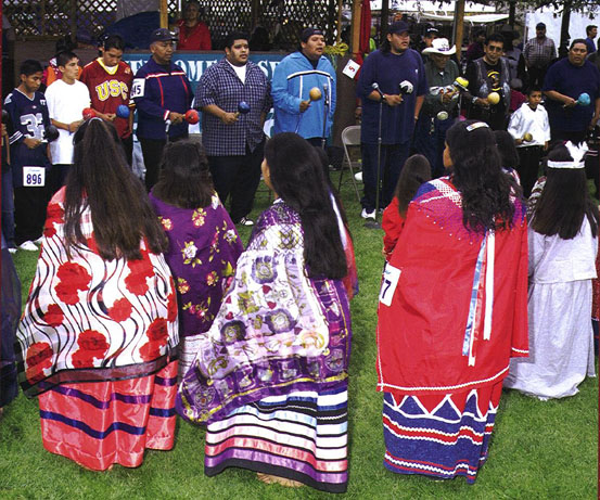 and lead singer. Ron Christman, Bird singer, is the announcer for the Yuman song and dance completion. This long time resident of the Viejas reservation is often called upon to establish the proper orientation. He has long been a good supporter of local Native American events and especially, from the very beginning, the first Sycuan Pow wow. Peon songs are sung in the evening into the early hours of the morning. Often youth groups form into teams and start early in the evening and the adult trams competing organize and warm up well after midnight. "Peon" is a highly competitive game of complex strategy, skill and calculation. It is played with eight players - four on each side, with an additional man or woman to act as umpire (Koymi). The two sides are usually made up of male or female players from different tribes or bands. The object of the game is for one side to win all the tally sticks. Much betting accompanies the game among both the men and the women. The game may be won in a short time, or it may - as frequently happens - prolong itself through an entire night, until the early morning, with several hundred dollars changing hands! How Peon is played: Someone will select a smooth vacant place and build a small fire and spread his blanket and sit down. He will then holler "pe-own-e." No one seems to pay any attention to him. By and by, he will again holler "Pe-own-e." Then perhaps someone will come and sit down with him and hold his blanket on his lap. Eventually a couple more players will come until there is a full team on each side. There seems to be no hurry. Each side has a blanket. Support singers or friends and family from each team - or band -will come and stand behind the players while the game is in progress and sing the "Peon Songs" as the game is in progress. The songs have meaning and tell a story. They also set the mood for the game. Tally Sticks: