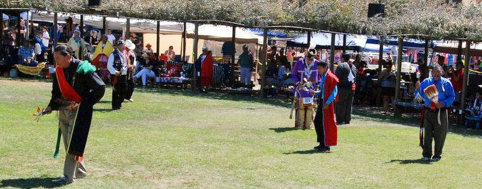 At the grand entry, the Indian flag eagle staff was carried by Danny Tucker, Sycuan Tribal Chairman. They are followed by the Sycuan Color Guard and a massive, glorious group of 400 or more Native American pow wow participants in category regalia.